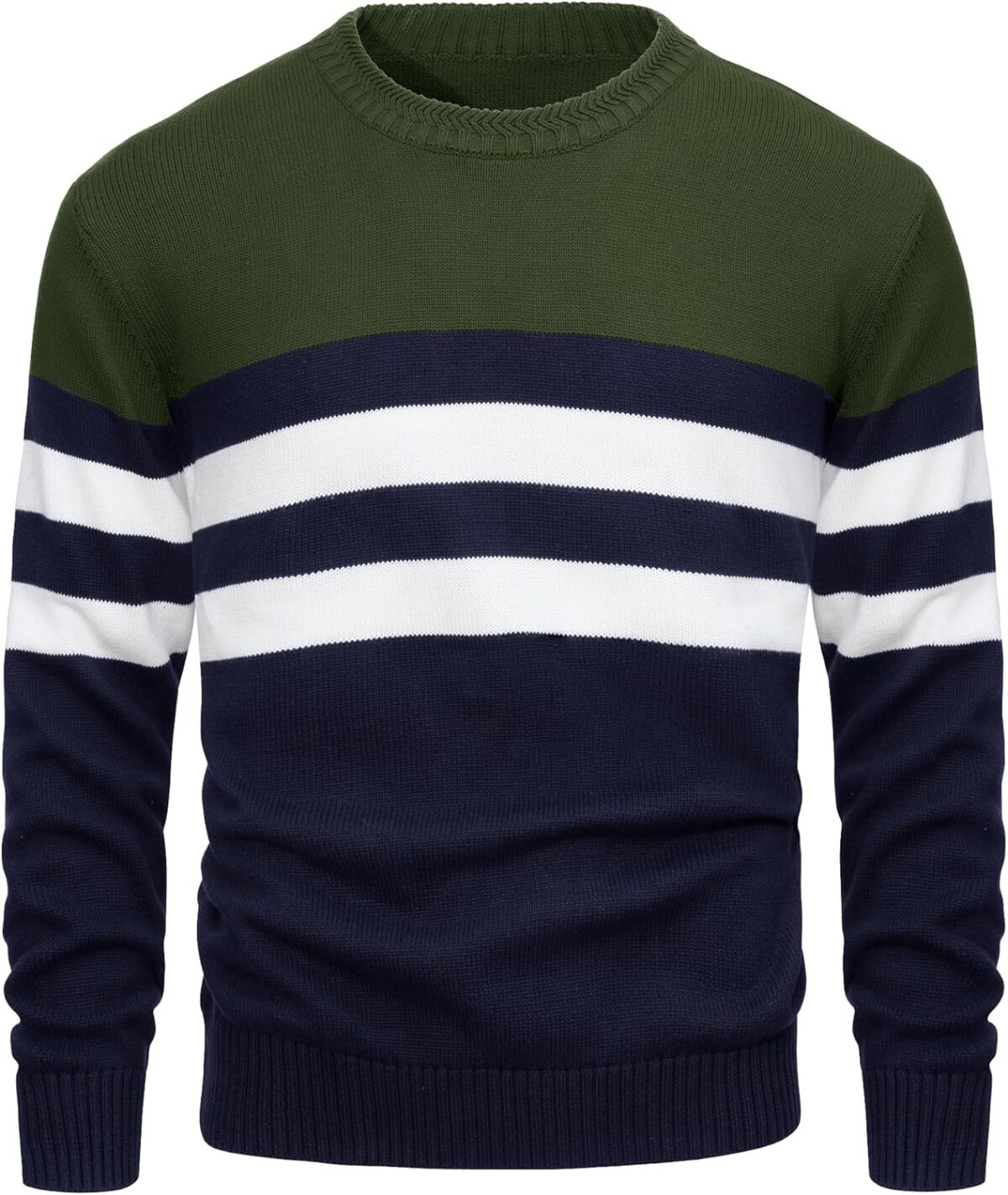 Men’s Crewneck Sweater Color Block Striped Sweatshirt Soft Thermal Knitted