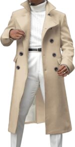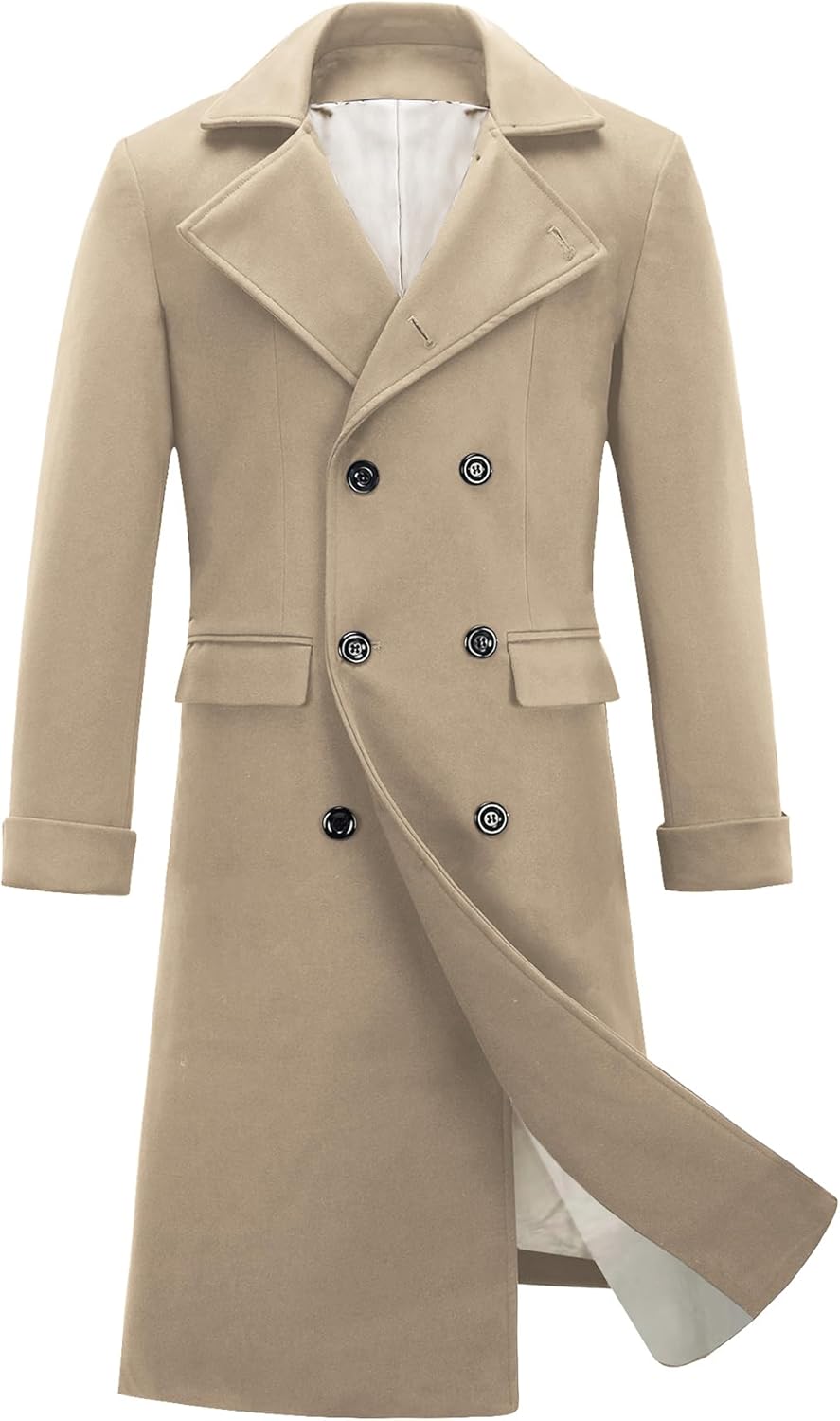 Men’s Trench Coat Notch Lapel Slim Fit Double Breasted Wool Blend Long Pea Coat Winter Warm Overcoat